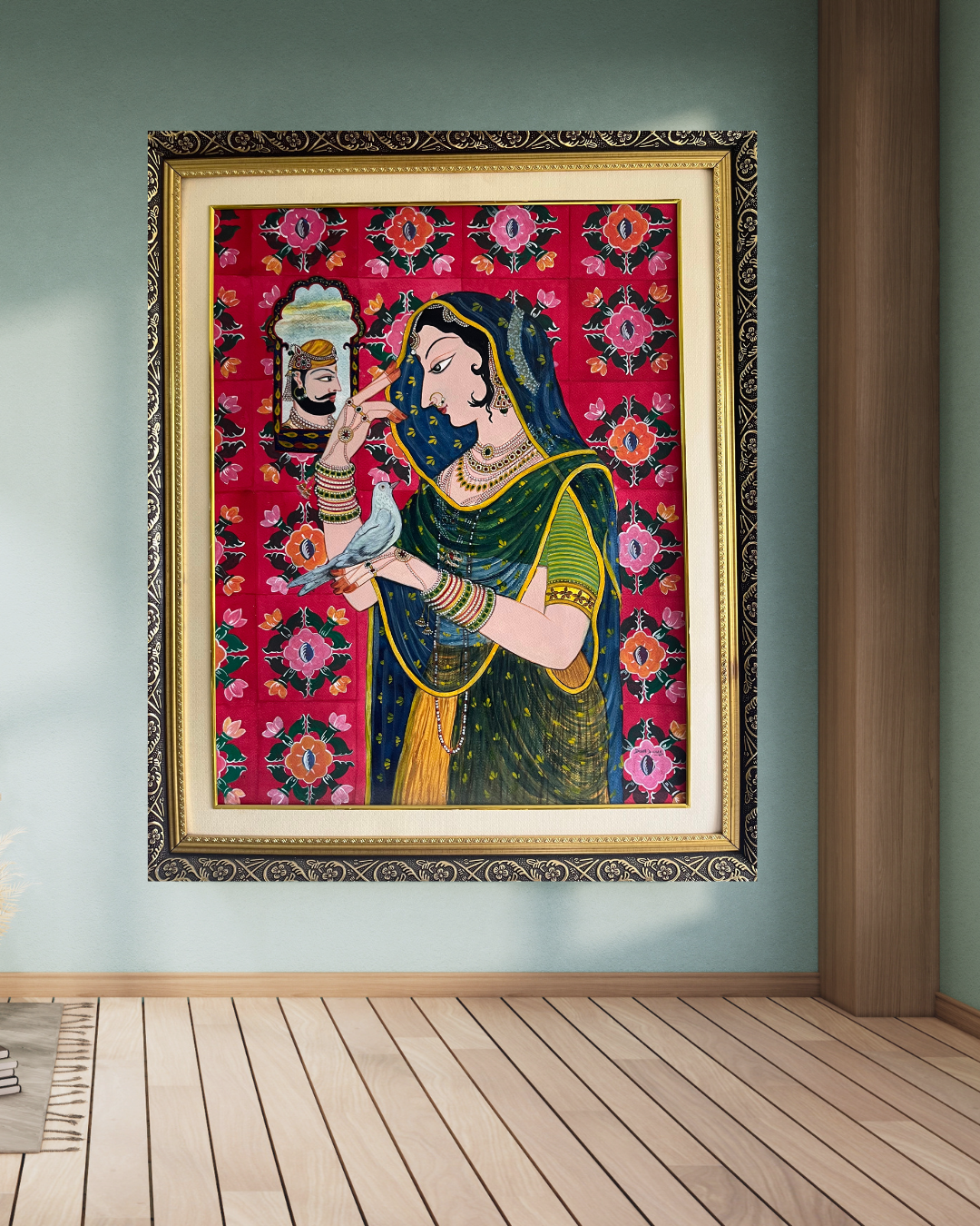 Kangra style~ Indian heritage style painting depicting the Long-distance relationship between a Queen and King where pigeons were used to send messages and stay in touch. This detailed artwork is a collectors dream on the wall adding life and vibrancy to light walls.