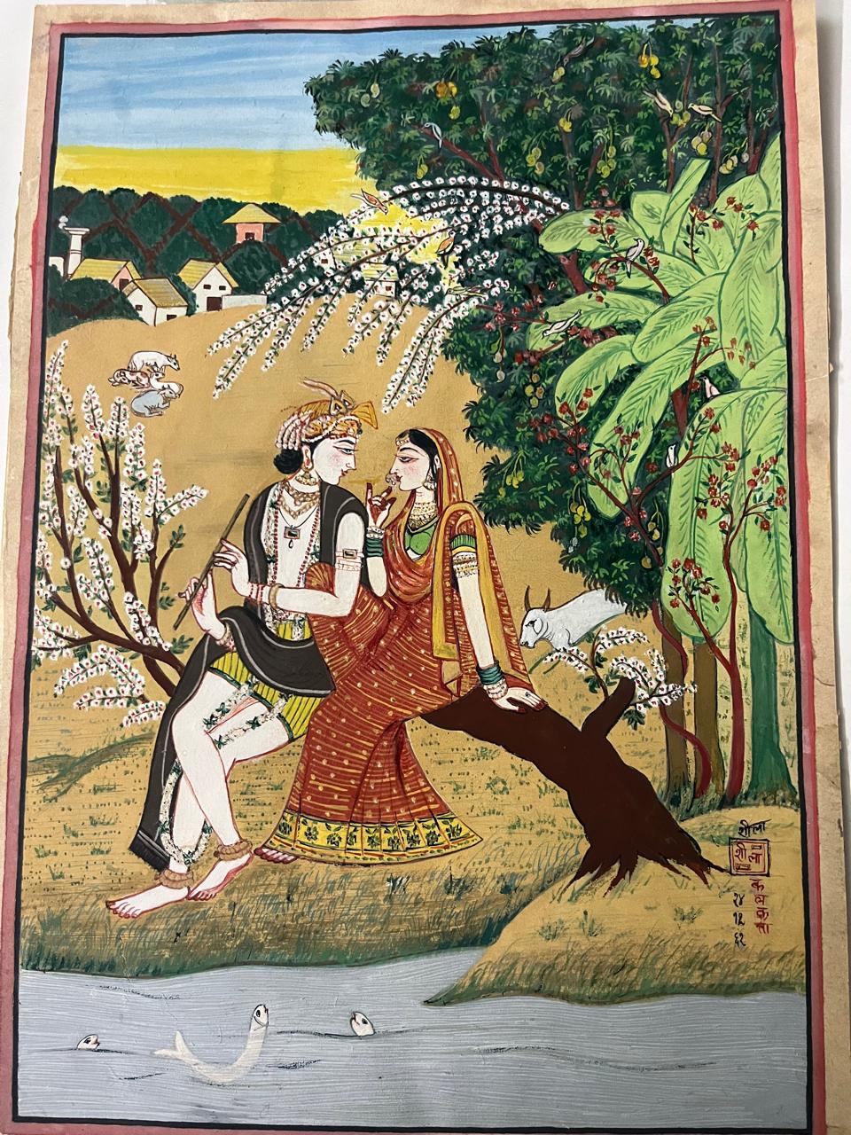 This painting made by Sheela Devi Sancheti in 1962 is a masterpiece of Kangra Style, watercolour on Kents Paper. This art work depicts Lord Krishna with his beloved Lady Radha sitting on a tree branch.